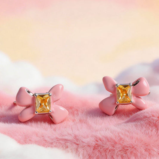 Wholesale 5 Pairs Set Brass Pink Enamel Bowknot Earrings with Yellow Cubic Zirconia Sweet Romantic Bow Studs for Daily Wear