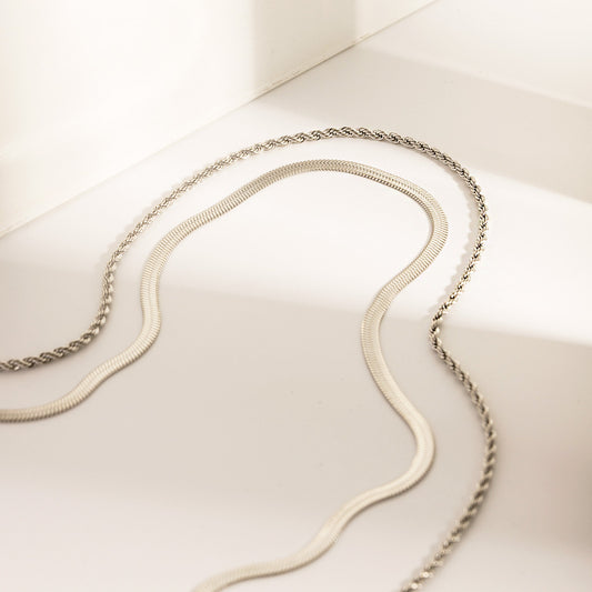 Stainless steel silver double layer herringbone twist rope stacking chain necklaces Set of 5