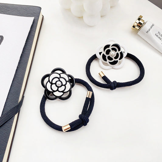 Ponytail decoration plastic black and white camellia flower hair tie bands (5 pcs)