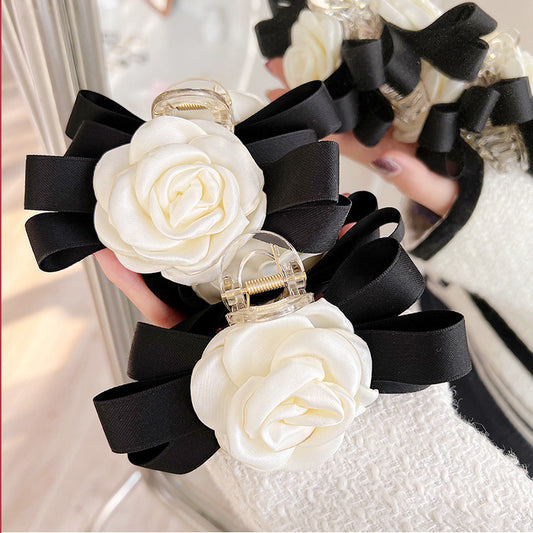 Wholesale white camellia flower black ribbon hair claw clips (5 pcs)