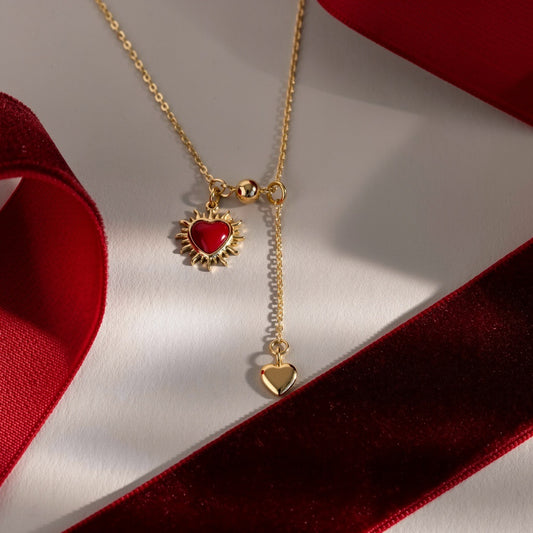 • Front view on model of red agate heart sunburst charm necklace with heart drop pendant