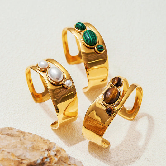 • Close-up of gold gemstone bracelet set featuring pearl and tiger eye cuff worn as a natural stone open bangle ideal for small Valentines gifts for her and bracelet wholesale.