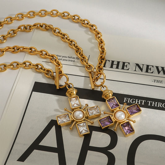 Gold Cross Pendant Necklace for Women Stainless Steel Chunky Chain with Pearl and Crystal Y2K Aesthetic Jewelry Gift Set of 5