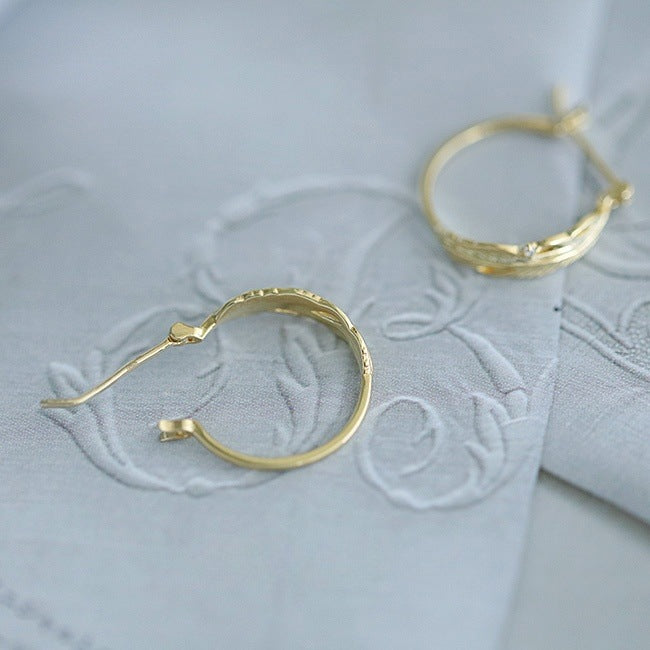 Inspired by Japanese-style minimalism and nature's elegance, the earrings feature a stylized feather and leaf pattern wrapped along a classic hoop. The design is light, fluid, and balanced, offering effortless charm that suits both casual outfits and refined ensembles.