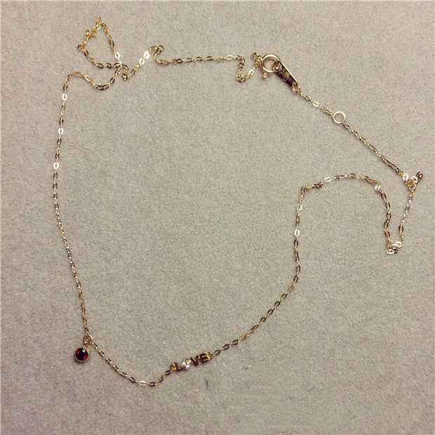 This elegant necklace features a romantic two-sided design — a shimmering red cubic zirconia on one side and the word "LOVE" on the other, with a sparkling stone embedded in the letter "O". A charming piece that captures both passion and modern minimalism.