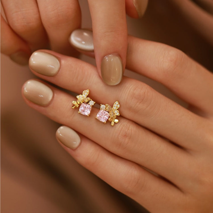 These earrings combine a petite butterfly silhouette with a central sparkle of pink or blue zirconia. The stud design offers secure and comfortable wear, perfect for adding a subtle yet graceful statement to any outfit.