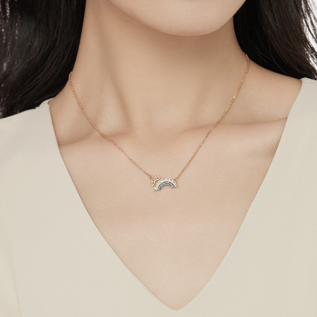 Crafted from genuine 925 sterling silver and plated with 18K gold for a luxurious finish. Features a colorful cubic zirconia pendant that offers brilliance and durability.