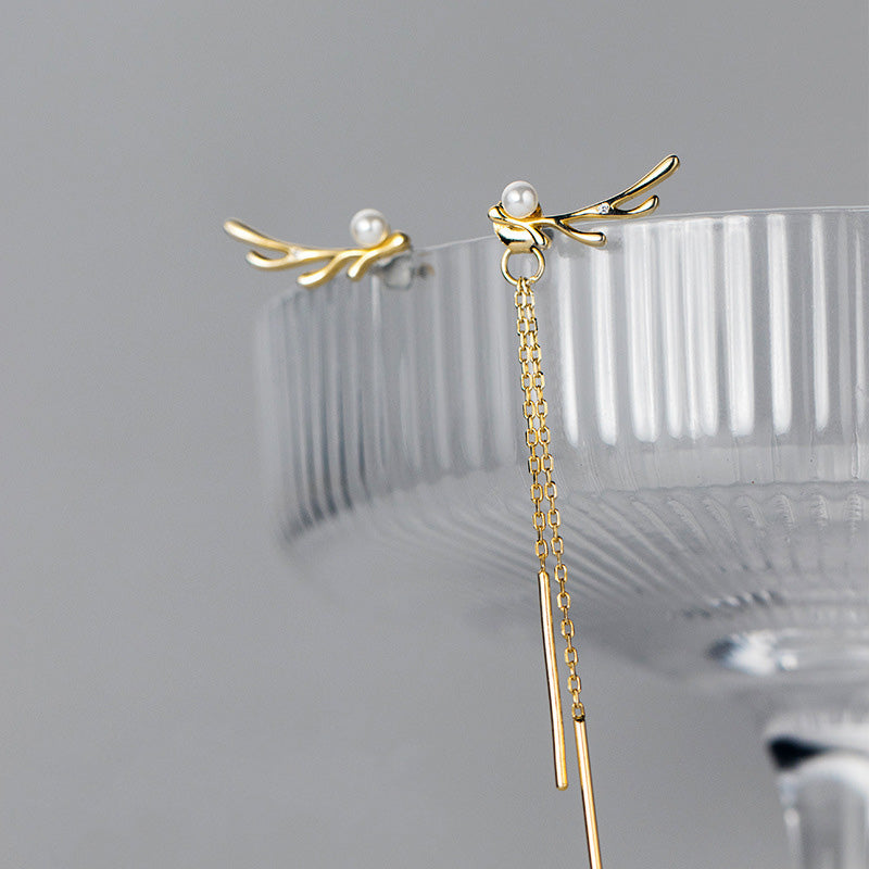 The earrings showcase an artistic antler design paired with luminous pearls, creating a graceful asymmetry that feels both delicate and distinctive. The back-drop structure brings a dynamic and layered effect, making them a perfect statement for women who appreciate subtle elegance mixed with modern flair. -