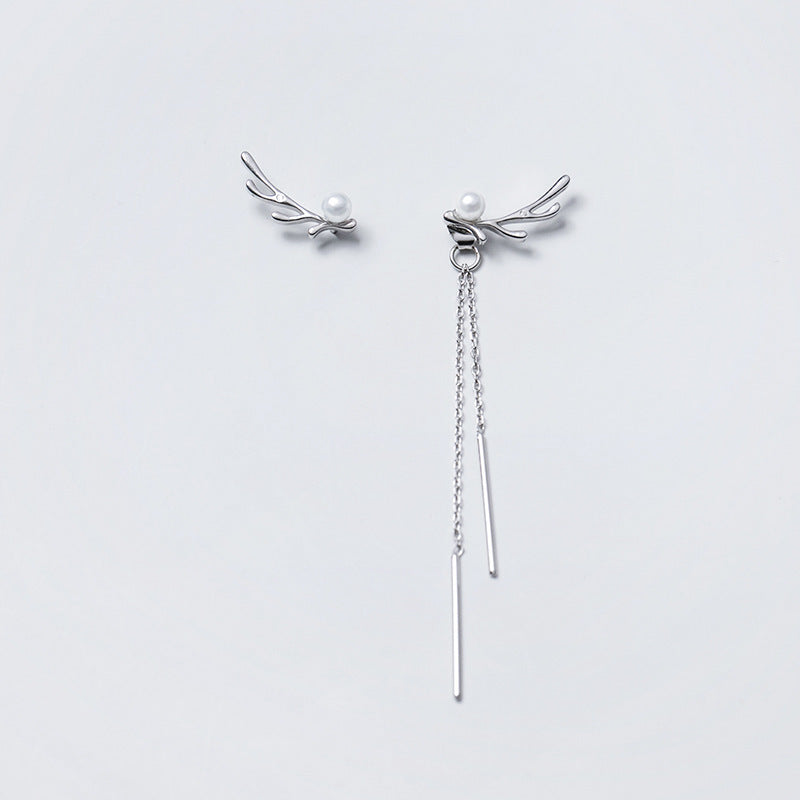 A pair of asymmetrical earrings inspired by the natural curve of antlers, featuring soft, glowing pearls that add a gentle contrast to the sleek silver silhouette. The back-hanging design gives the earrings a floating, sophisticated movement, offering a fresh interpretation of modern feminine jewelry.