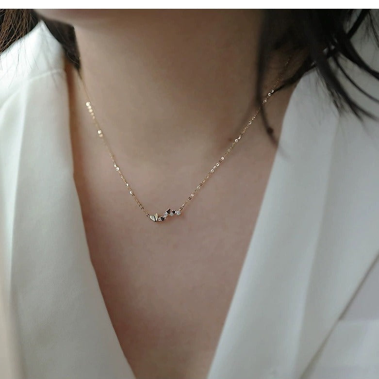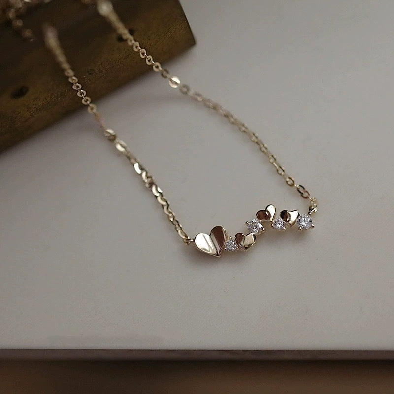 A sweet and romantic necklace featuring a combination of large and small heart-shaped zircon stones. Simple yet charming, this design adds a touch of sparkle and elegance to your everyday or special occasion looks.