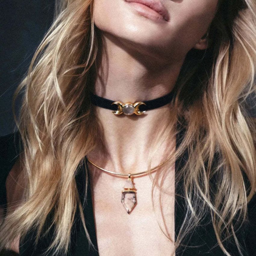 This layered blue pendant necklace set is made for wholesale buyers who want an elevated two layer look that sells across art inspired and minimal styling trends. The set pairs a black choker with a triple moon centerpiece and a round stone look detail, plus a gold tone collar chain finished with a geometric blue pendant that adds a modern pop of color. The layered silhouette creates instant styling value for boutiques and online sellers because it can be worn together for a statement look or separated for mix and match merchandising.