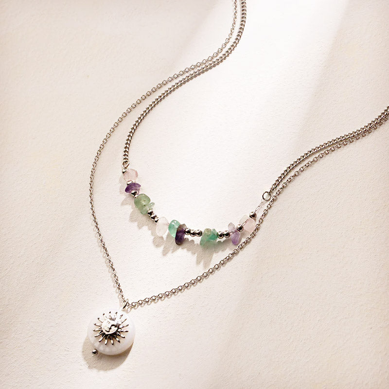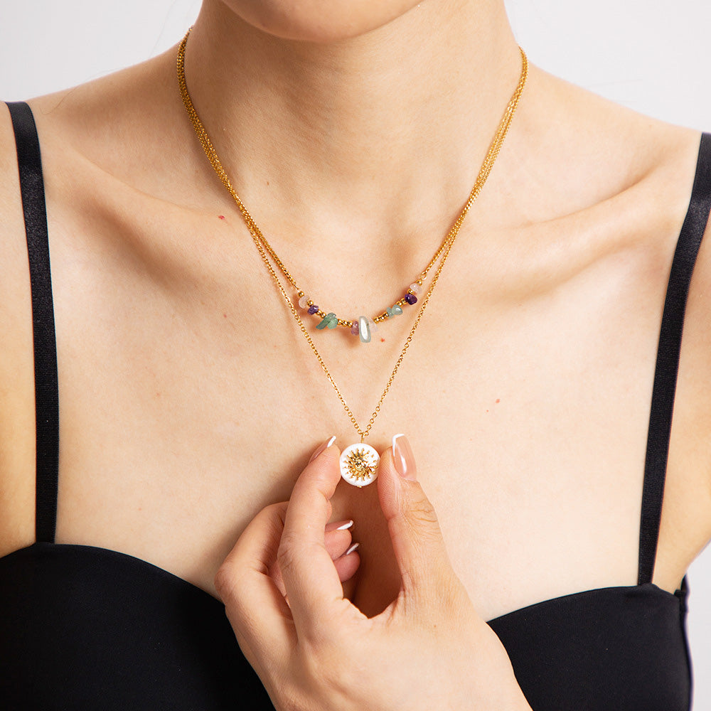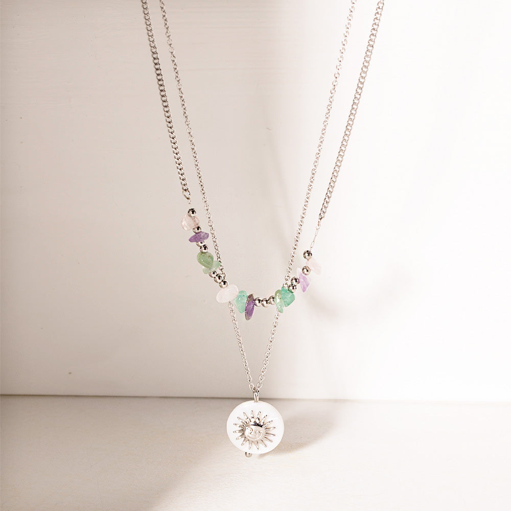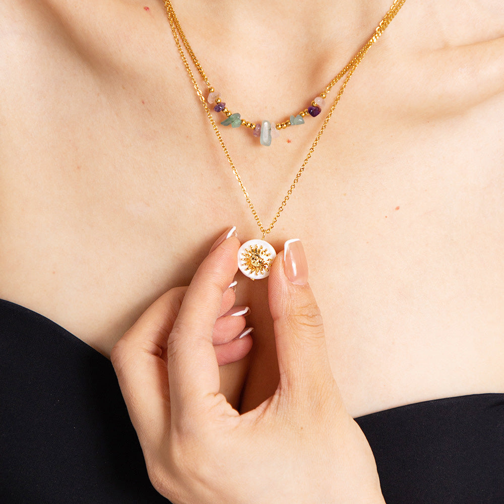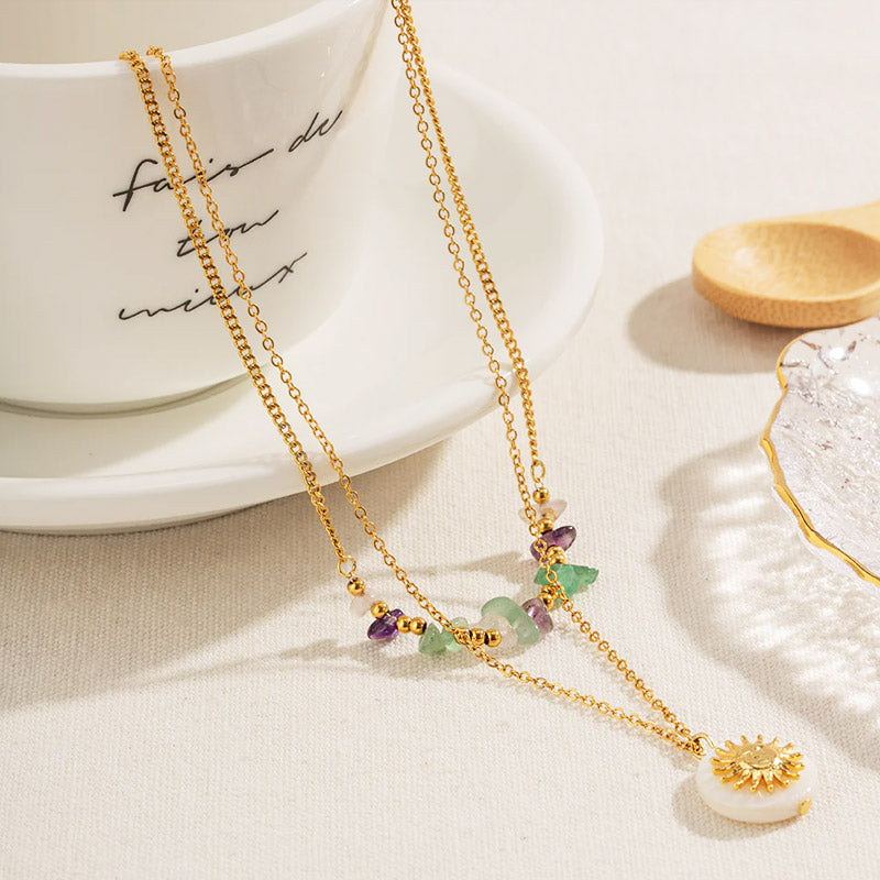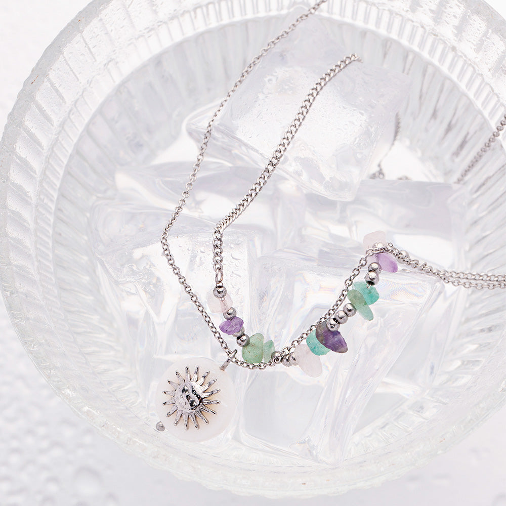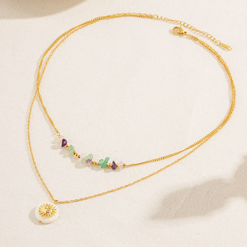 Stainless steel beach style color rocks shell sun pendant layered necklaces Set of 5