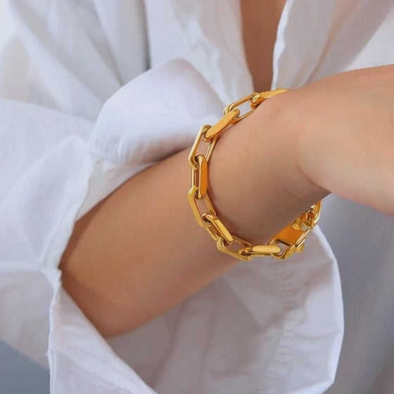 This bold design features oversized stainless steel chains with a polished finish, creating a modern chunky chain jewelry look. The coordinated necklace and bracelet form a powerful stainless steel chain jewelry set that complements street style, statement outfits, and trend driven fashion collections.