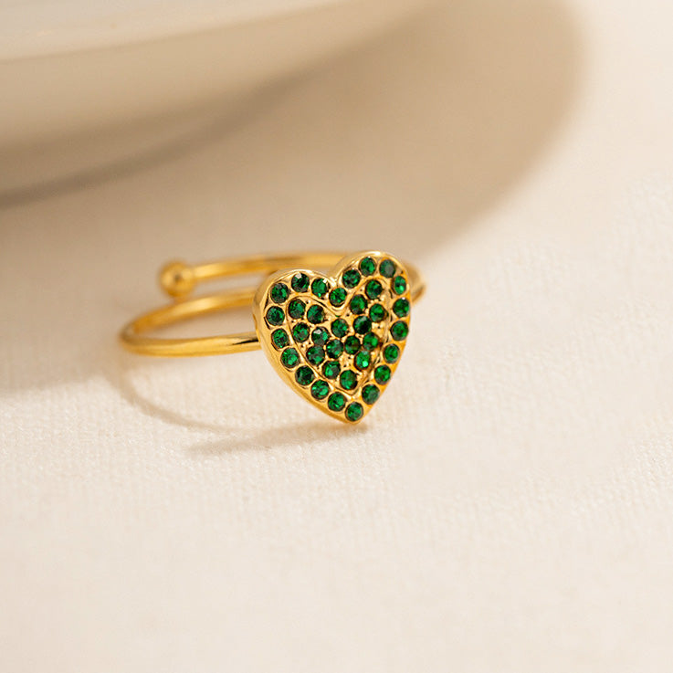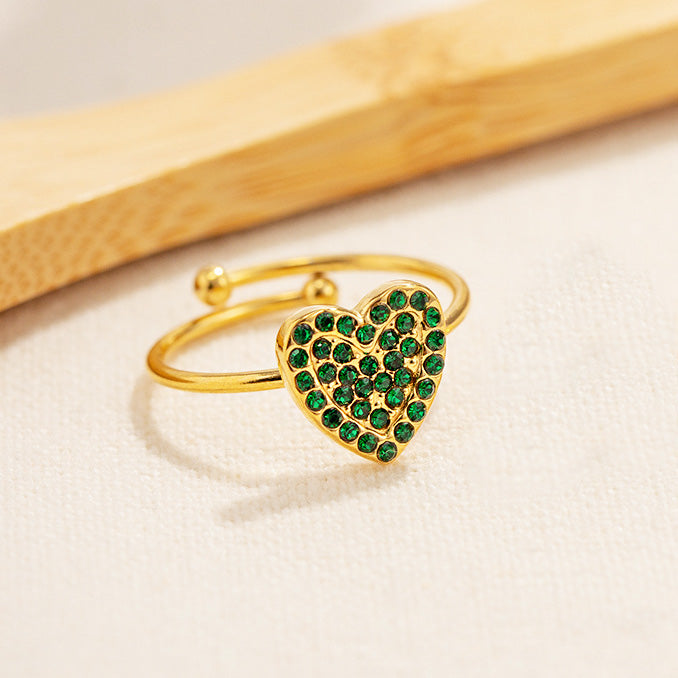Stainless steel gold pave green zircon heart adjustable rings Set of 5