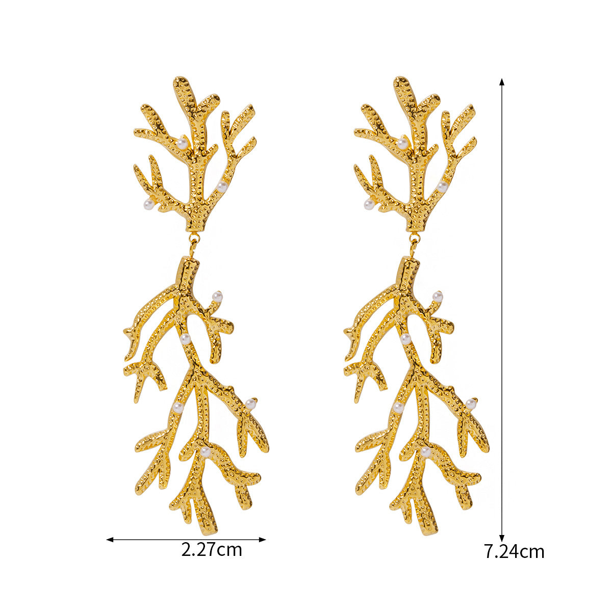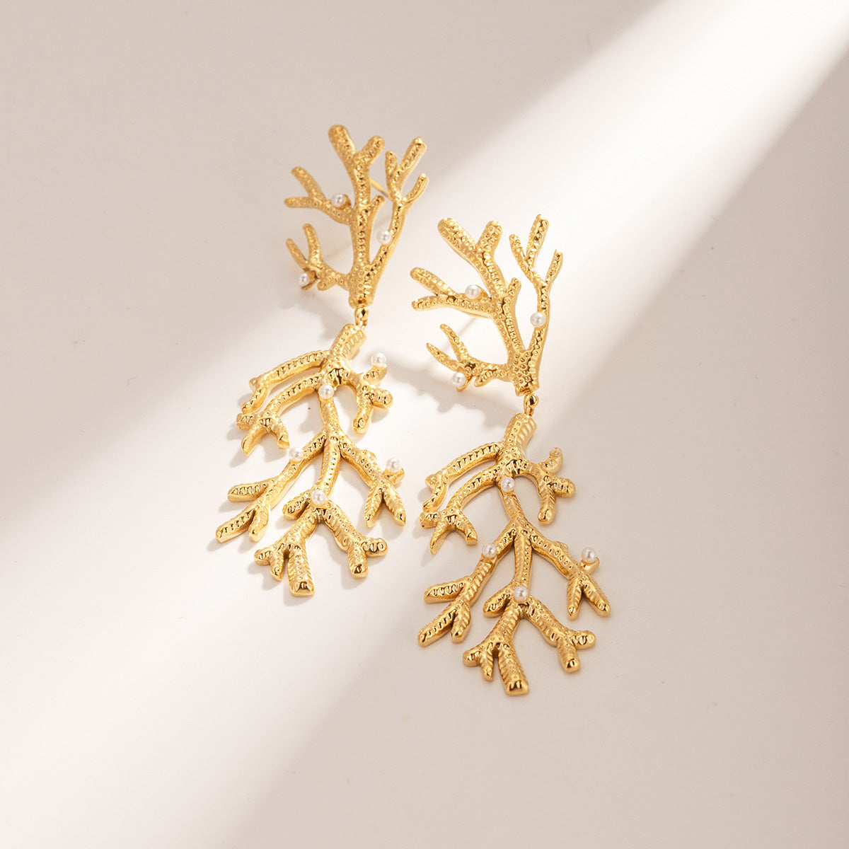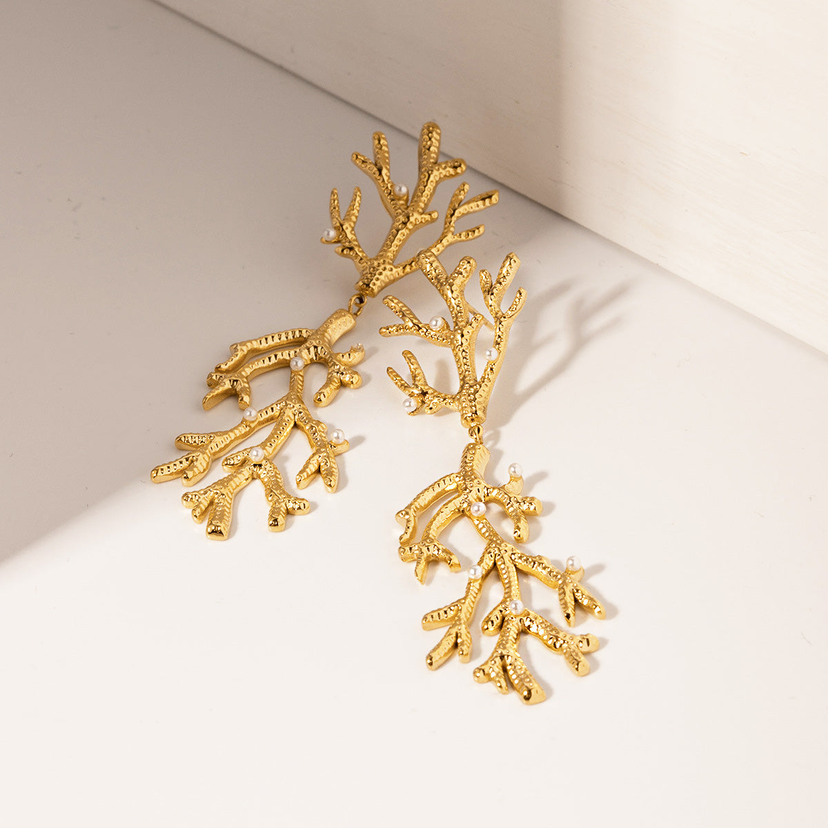 Stainless steel gold plated pearl coral branch drop earrings (5 pairs)