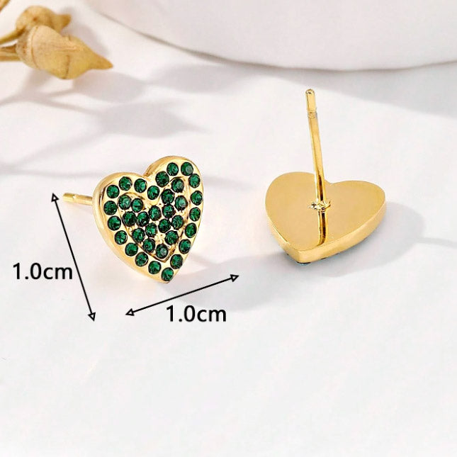 Stainless steel waterproof gold pave green zircon heart stud earrings (5 pairs)