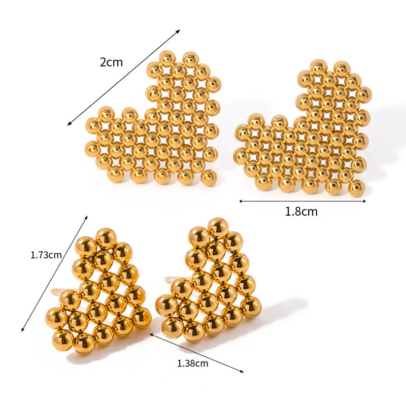 Stainless steel waterproof gold round bead love heart shaped stud earrings (5 pairs)